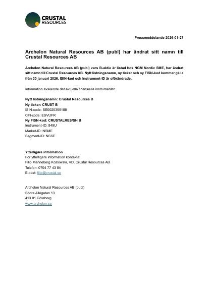 Archelon Natural Resources AB (publ) vars B-aktie är listad hos NGM Nordic SME, har ändrat sitt namn till Crustal Resources AB. Nytt listningsnamn, ny ticker och ny FISN-kod kommer gälla från 30 januari 2026. ISIN-kod och Instrument-ID är oförändrade.