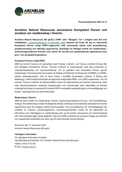 Archelon Natural Resources AB (publ) ("ANR" eller "Bolaget") har i enlighet med det som meddelades i pressmeddelande 5 december 2025 beslutat att knyta till sig en oberoende Kompetent Person enligt PERC-regelverket inför kommande arbete med prospektering, projektutveckling och offentlig rapportering. Samtidigt har Bolaget ansökt om medlemskap i branschorganisationen Svemin, som verkar för korrekt och standardiserad rapportering inom gruv- och prospekteringssektorn.