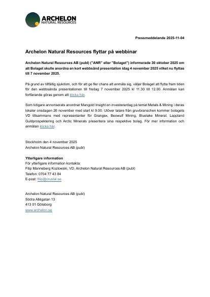 Archelon Natural Resources AB (publ) ("ANR" eller "Bolaget") informerade 30 oktober 2025 om att Bolaget skulle anordna en kort webbsänd presentation idag 4 november 2025 vilket nu flyttas till 7 november 2025.