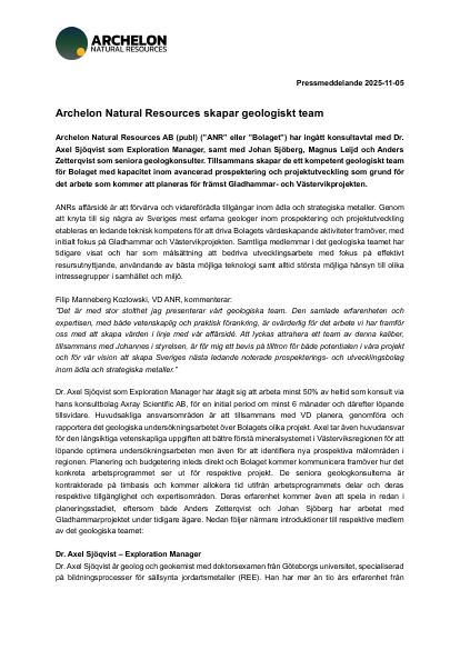Archelon Natural Resources AB (publ) ("ANR" eller "Bolaget") har ingått konsultavtal med Dr. Axel Sjöqvist som Exploration Manager, samt med Johan Sjöberg, Magnus Leijd och Anders Zetterqvist som seniora geologkonsulter. Tillsammans skapar de ett kompetent geologiskt team för Bolaget med kapacitet inom avancerad prospektering och projektutveckling som grund för det arbete som kommer att planeras för främst Gladhammar- och Västervikprojekten.