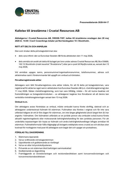 Aktieägarna i Crustal Resources AB, 559308-7397, kallas till årsstämma onsdagen den 20 maj 2026 kl. 14:00 i Cecil Coworkings lokaler på Norrlandsgatan 10 i Stockholm.