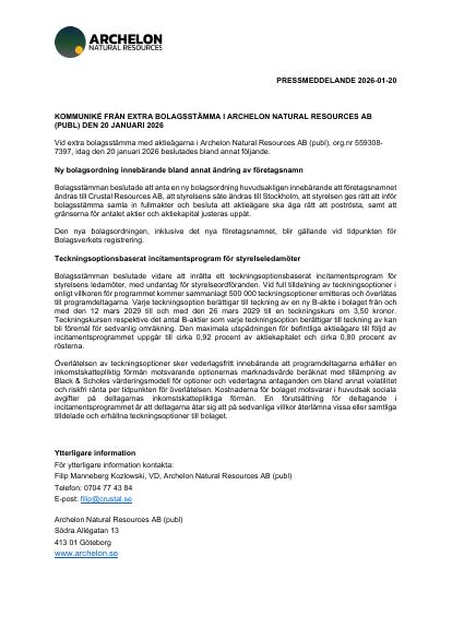 Vid extra bolagsstämma med aktieägarna i Archelon Natural Resources AB (publ), org.nr 559308-7397, idag den 20 januari 2026 beslutades bland annat följande.