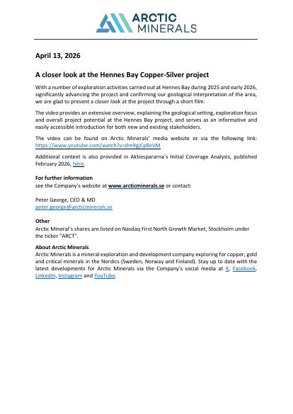 Arctic Minerals is a mineral exploration and development company exploring for copper, gold and critical minerals in the Nordics (Sweden, Norway and Finland). Stay up to date with the latest developments for Arctic Minerals via the Company's social media at X, Facebook, LinkedIn, Instagram and YouTube.