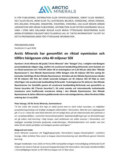 Styrelsen i Arctic Minerals AB (publ) ("Arctic Minerals" eller "Bolaget") har, i enlighet med Bolagets pressmeddelande tidigare idag, slutfört ett accelererat bookbuilding-förfarande samt beslutat om en riktad nyemission om 7 619 047 aktier till en teckningskurs om 5,25 SEK per aktie (den "Riktade Nyemissionen"). Den Riktade Nyemissionen tillför Bolaget cirka 40 miljoner SEK före avdrag för kostnader hänförliga till den Riktade Nyemissionen. Storleken på den Riktade Nyemissionen ökades till 40 miljoner SEK från det initialt aviserade beloppet om 30 miljoner SEK till följd av stark efterfrågan i det accelererade bookbuilding-förfarandet. Teckningskursen för aktierna i den Riktade Nyemissionen har fastställts genom ett accelererat bookbuilding-förfarande som genomförts av Pareto Securities AB ("Pareto Securities"). Ett antal svenska och internationella institutionella investerare samt kvalificerade investerare deltog i den Riktade Nyemissionen. Den Riktade Nyemissionen är delvis villkorad av godkännande vid en extra bolagsstämma, vilken förväntas hållas omkring den 11 maj 2026.