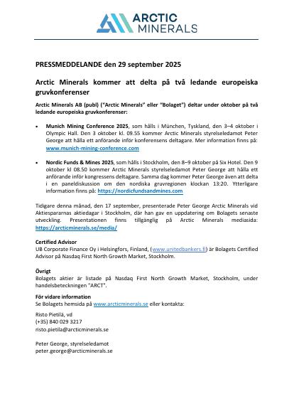 - Munich Mining Conference 2025, som hålls i München, Tyskland, den 3-4 oktober i Olympic Hall. Den 3 oktober kl. 09.55 kommer Arctic Minerals styrelseledamot Peter George att hålla ett anförande inför konferensens deltagare. Mer information finns på: www.munich-mining-conference.com