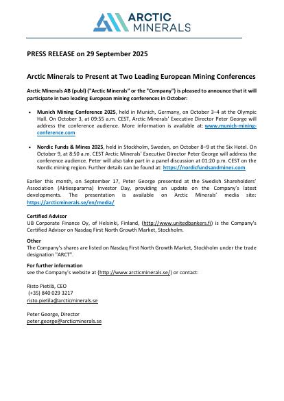 - Nordic Funds & Mines 2025, held in Stockholm, Sweden, on October 8-9 at the Six Hotel. On October 9, at 8:50 a.m. CEST Arctic Minerals' Executive Director Peter George will address the conference audience. Peter will also take part in a panel discussion at 01:20 p.m. CEST on the Nordic mining region. Further details can be found at: https://nordicfundsandmines.com