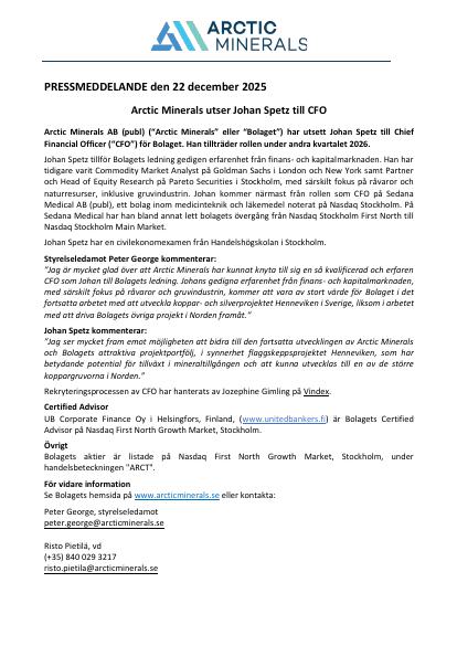 Arctic Minerals AB (publ) ("Arctic Minerals" eller "Bolaget") har utsett Johan Spetz till Chief Financial Officer ("CFO") för Bolaget. Han tillträder rollen under andra kvartalet 2026.