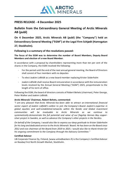 On 4 December 2025, Arctic Minerals AB (publ) (the "Company") held an Extraordinary General Meeting ("EGM") at the Legal Firm Schjødt (Hamngatan 27, Stockholm).