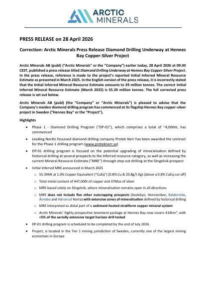 Arctic Minerals AB (publ) ("Arctic Minerals" or the "Company") earlier today, 28 April 2026 at 09:30 CEST, published a press release titled Diamond Drilling Underway at Hennes Bay Copper-Silver Project. In the press release, reference is made to the project's reported Initial Inferred Mineral Resource Estimate as presented in March 2025. In the English version of the press release, it is incorrectly stated that the Initial Inferred Mineral Resource Estimate amounts to 39 million tonnes. The correct Initial Infered Mineral Resource Estimate (March 2025) is 55.39 million tonnes. The full corrected press release is set out below.