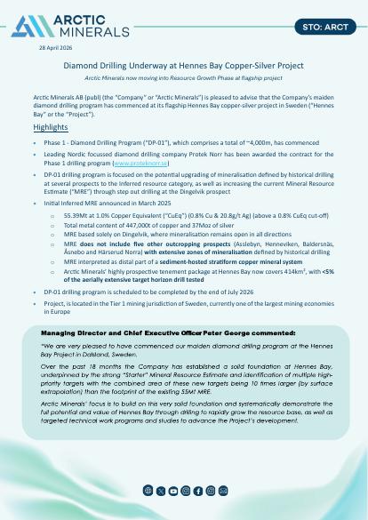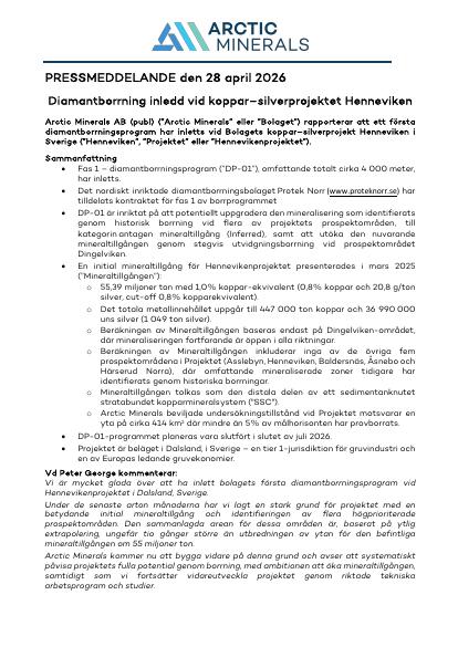 Arctic Minerals AB (publ) ("Arctic Minerals" eller "Bolaget") rapporterar att ett första diamantborrningsprogram har inletts vid Bolagets koppar-silverprojekt Henneviken i Sverige ("Henneviken", "Projektet" eller "Hennevikenprojektet").