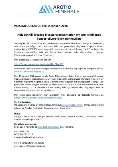 Torsdag den 15 januari 2026, kl 12.00 kommer styrelseledamot Peter George att presentera och svara på frågor om resultaten från en genomförd flygburen magnetotellurisk undersökning ("MMT") samt magnetisk vektorinversionsmodellering ("MVI") av historiska flygburna magnetiska data vid Hennevikens koppar- och silverprojekt i Sverige ("Hennevikenprojektet" eller "Projektet").