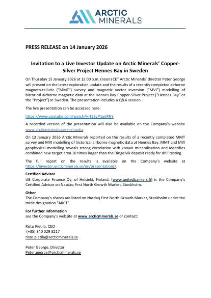 On Thursday 15 January 2026 at 12.00 p.m. (noon) CET Arctic Minerals' director Peter George will present on the latest exploration update and the results of a recently completed airborne magneto-telluric ("MMT") survey and magnetic vector inversion ("MVI") modelling of historical airborne magnetic data at the Hennes Bay Copper-Silver Project ("Hennes Bay" or the "Project") in Sweden. The presentation includes a Q&A session.