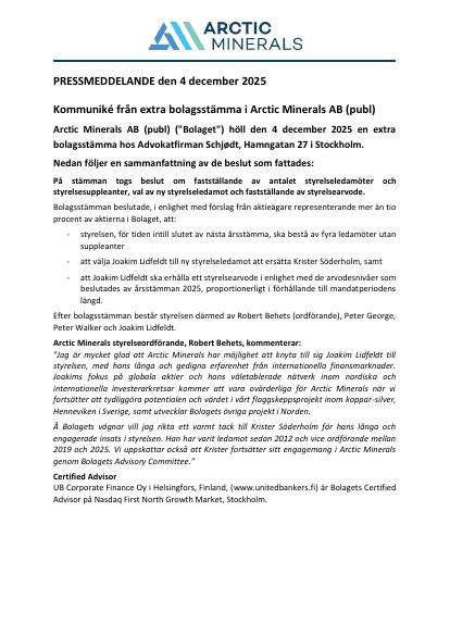 Arctic Minerals AB (publ) ("Bolaget") höll den 4 december 2025 en extra bolagsstämma hos Advokatfirman Schjødt, Hamngatan 27 i Stockholm.
