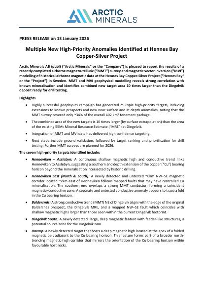 This information is information that Arctic Minerals AB (publ) is obliged to make public pursuant to the EU Market Abuse Regulation (EU) 596/2014. The information was submitted for publication, through the agency of the contact person set out above, at 08.30 a.m. CET on 13 January 2026.