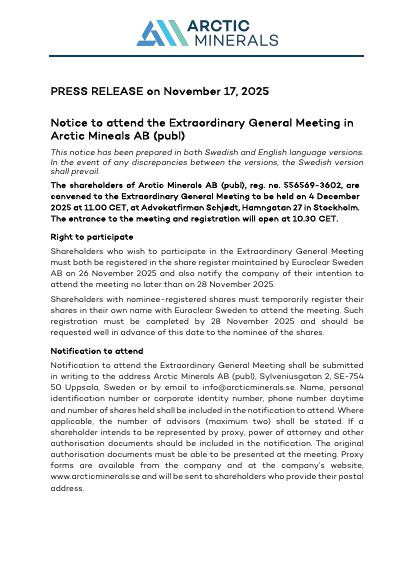 The shareholders of Arctic Minerals AB (publ), reg. no. 556569-3602, are convened to the Extraordinary General Meeting to be held on 4 December 2025 at 11.00 CET, at Advokatfirman Schjødt, Hamngatan 27 in Stockholm. The entrance to the meeting and registration will open at 10.30 CET.