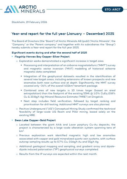 The Board of Directors (the "Board") of Arctic Minerals AB (publ) ("Arctic Minerals", the "Company" or the "Parent company" and together with its subsidiaries the "Group") hereby submits a Year-end report for the full year 2025.