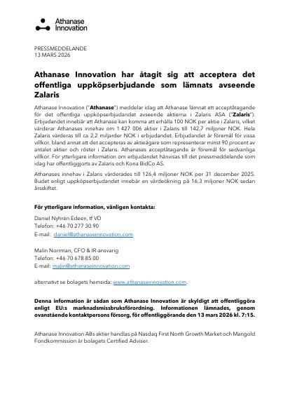 Athanase Innovation ("Athanase") meddelar idag att Athanase lämnat ett acceptåtagande för det offentliga uppköpserbjudandet avseende aktierna i Zalaris ASA ("Zalaris"). Erbjudandet innebär att Athanase kan komma att erhålla 100 NOK per aktie i Zalaris, vilket värderar Athanases innehav om 1 427 006 aktier i Zalaris till 142,7 miljoner NOK. Hela Zalaris värderas till ca 2,2 miljarder NOK i erbjudandet. Erbjudandet är föremål för vissa villkor, bland annat att det accepteras av aktieägare som representerar minst 90 procent av antalet aktier och röster i Zalaris. Athanases acceptåtagande är föremål för sedvanliga villkor. För ytterligare information om erbjudandet hänvisas till det pressmeddelande som idag har offentliggjorts av Zalaris och Kona BidCo AS.