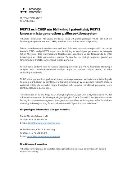 Tvisten, som kommunicerades i samband med Athanase Innovations rapport för det tredje kvartalet 2025, avsåg IVISYS import och försäljning av en tidigare generation av bolagets Pallet AI-system. Den kommersiella försäljningen upphörde under föregående år inför lanseringen av nästa generations system. Tvisten har nu slutligt reglerats genom en förlikning som träffats i samförstånd mellan parterna.
