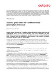 Autocirc Group AB (publ) (the "Company") today informed the holders of its up to SEK 1,500,000,000 senior secured callable floating rate bonds 2022/2025 with ISIN SE0017885916 issued by the Company (the "Bonds") of its intention to redeem the Bonds early, conditional upon the satisfaction by the Company of all conditions precedent required for utilisation under new debt facilities (the "Redemption").