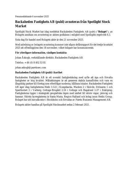 Spotlight Stock Market har idag meddelat Backaheden Fastighets AB (publ) ("Bolaget"), att Bolagets ansökan om avnotering av aktien godkänns i enlighet med Spotlights regelverk 6.3.