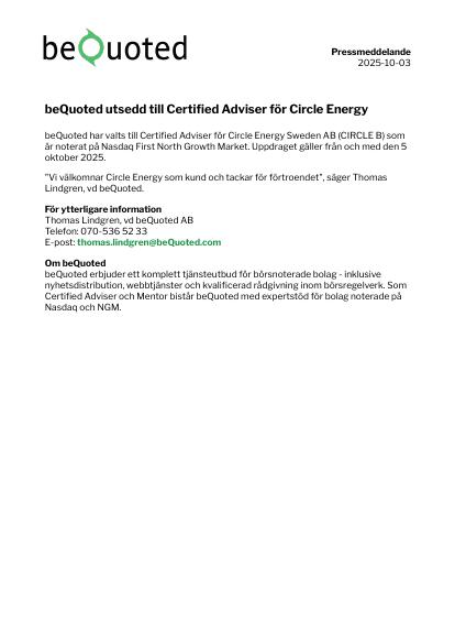 beQuoted har valts till Certified Adviser för Circle Energy Sweden AB (CIRCLE B) som är noterat på Nasdaq First North Growth Market. Uppdraget gäller från och med den 5 oktober 2025.