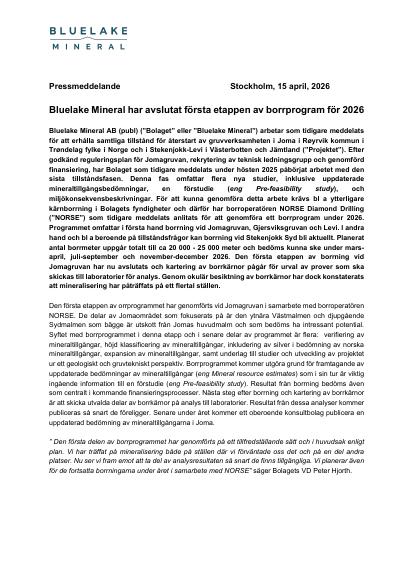 Bluelake Mineral AB (publ) ("Bolaget" eller "Bluelake Mineral") arbetar som tidigare meddelats för att erhålla samtliga tillstånd för återstart av gruvverksamheten i Joma i Røyrvik kommun i Trøndelag fylke i Norge och i Stekenjokk-Levi i Västerbotten och Jämtland ("Projektet"). Efter godkänd reguleringsplan för Jomagruvan, rekrytering av teknisk ledningsgrupp och genomförd finansiering, har Bolaget som tidigare meddelats under hösten 2025 påbörjat arbetet med den sista tillståndsfasen. Denna fas omfattar flera nya studier, inklusive uppdaterade mineraltillgångsbedömningar, en förstudie (eng Pre-feasibility study), och miljökonsekvensbeskrivningar. För att kunna genomföra detta arbete krävs bl a ytterligare kärnborrning i Bolagets fyndigheter och därför har borroperatören NORSE Diamond Drilling ("NORSE") som tidigare meddelats anlitats för att genomföra ett borrprogram under 2026. Programmet omfattar i första hand borrning vid Jomagruvan, Gjersviksgruvan och Levi. I andra hand och bl a beroende på tillståndsfrågor kan borrning vid Stekenjokk Syd bli aktuellt. Planerat antal borrmeter uppgår totalt till ca 20 000 - 25 000 meter och bedöms kunna ske under mars-april, juli-september och november-december 2026. Den första etappen av borrning vid Jomagruvan har nu avslutats och kartering av borrkärnor pågår för urval av prover som ska skickas till laboratorier för analys. Genom okulär besiktning av borrkärnor har dock konstaterats att mineralisering har påträffats på ett flertal ställen.