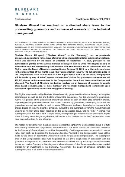 Bluelake Mineral AB (publ) ("Bluelake Mineral" or the "Company") has, as previously announced, completed a rights issue of shares with preferential rights for existing shareholders, which was resolved by the Board of Directors on September 17, 2025, pursuant to the authorization granted by the Annual General Meeting on May 15, 2025 ("the Rights Issue"). In accordance with the underwriting commitments that were entered into in connection with the Rights Issue, the Board of Directors resolved today, October 21, 2025, on a directed share issue to the underwriters of the Rights Issue (the "Compensation Issue"). The subscription price in the Compensation Issue is the same as in the Rights Issue, SEK 1.55 per share, and payment will be made by way of set-off against underwriters' claims for guarantee compensation. All 452,717 shares to the underwriters in the Compensation Issue have been subscribed for and allocated. The Board of Directors has further resolved on an issuance of warrants to enable share-based compensation to mine manager and technical management, conditional upon subsequent approval by an extraordinary general meeting.