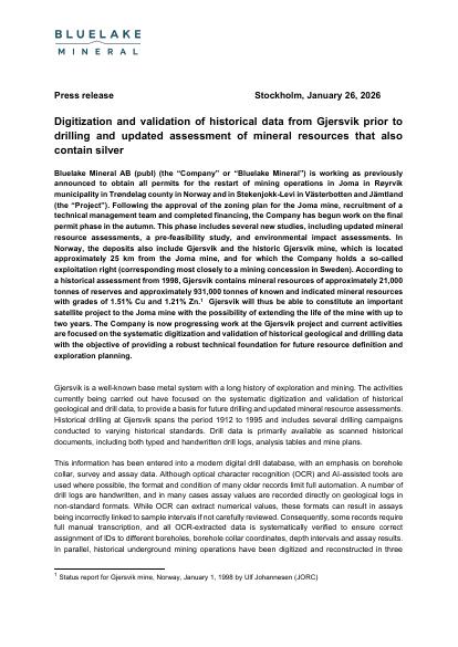 Bluelake Mineral AB (publ) (the "Company" or "Bluelake Mineral") is working as previously announced to obtain all permits for the restart of mining operations in Joma in Røyrvik municipality in Trøndelag county in Norway and in Stekenjokk-Levi in Västerbotten and Jämtland (the "Project"). Following the approval of the zoning plan for the Joma mine, recruitment of a technical management team and completed financing, the Company has begun work on the final permit phase in the autumn. This phase includes several new studies, including updated mineral resource assessments, a pre-feasibility study, and environmental impact assessments. In Norway, the deposits also include Gjersvik and the historic Gjersvik mine, which is located approximately 25 km from the Joma mine, and for which the Company holds a so-called exploitation right (corresponding most closely to a mining concession in Sweden). According to a historical assessment from 1998, Gjersvik contains mineral resources of approximately 21,000 tonnes of reserves and approximately 931,000 tonnes of known and indicated mineral resources with grades of 1.51% Cu and 1.21% Zn. Gjersvik will thus be able to constitute an important satellite project to the Joma mine with the possibility of extending the life of the mine with up to two years. The Company is now progressing work at the Gjersvik project and current activities are focused on the systematic digitization and validation of historical geological and drilling data with the objective of providing a robust technical foundation for future resource definition and exploration planning.