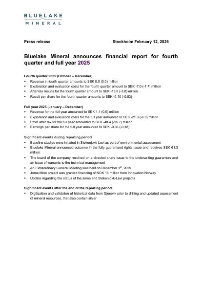 This information is inside information which Bluelake Mineral AB (publ) is required to publish in accordance with the EU Market Abuse Regulation. The information was submitted for publication on February 12, 2026, at 8.40 CET, by the contact person below.