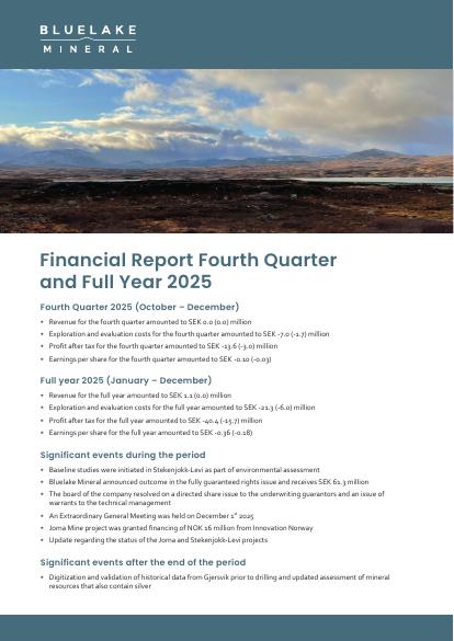 - Bluelake Mineral announced outcome in the fully guaranteed rights issue and receives SEK 61.3 million