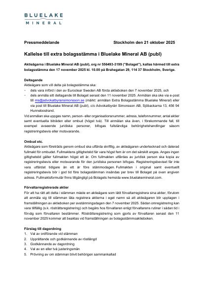 Aktieägarna i Bluelake Mineral AB (publ), org nr 556493-3199 ("Bolaget"), kallas härmed till extra bolagsstämma den 17 november 2025 kl. 10.00 på Brahegatan 29, 114 37 Stockholm, Sverige.