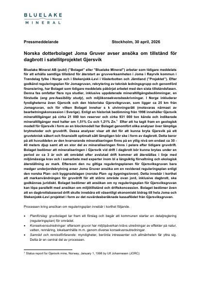 Bluelake Mineral AB (publ) ("Bolaget" eller "Bluelake Mineral") arbetar som tidigare meddelats för att erhålla samtliga tillstånd för återstart av gruvverksamheten i Joma i Røyrvik kommun i Trøndelag fylke i Norge och i Stekenjokk-Levi i Västerbotten och Jämtland ("Projektet"). Efter godkänd reguleringsplan för Jomagruvan, rekrytering av teknisk ledningsgrupp och genomförd finansiering, har Bolaget som tidigare meddelats påbörjat arbetet med den sista tillståndsfasen. Denna fas omfattar flera nya studier, inklusive uppdaterade mineraltillgångsbedömningar, en förstudie (eng pre-feasibility study), och miljökonsekvensbeskrivningar. I Norge inkluderar fyndigheterna även Gjersvik och den historiska Gjersvikgruvan, som ligger ca 25 km från Jomagruvan, och för vilken Bolaget innehar s k utvinningsrätt (motsvaras närmast av bearbetningskoncession i Sverige). Enligt en historisk bedömning från 1998 innehåller Gjersvik mineraltillgångar på cirka 21 000 ton reserver och cirka 931 000 ton kända och indikerade mineraltillgångar med halter om 1,51% Cu och 1,21% Zn.1 Efter att ha tagit fram en geologisk modell för Gjersvik i form av en blockmodell har Bolaget genomfört olika analyser över lämpliga brytmetoder och gruvdrift. Dessa analyser visar att det för att kunna bryta Gjersvik på ett gruvteknisk säkert och finansiellt optimalt sätt lämpligen bör ske i form av dagbrott. Detta beror på att huvuddelen av den kvarvarande mineraliseringen finns på en ytlig nivå om endast ca 30 - 40 meters djup samt att en stor del av mineraliseringen finns i pelare efter tidigare gruvdrift. Bolaget bedömer att mineraliseringen i Gjersvik vid drift i dagbrott bör kunna brytas under en period av ca 3 år och att området efter avslutad drift kommer att återställas i linje med miljömässiga krav och i samarbete med experter inom bl a långsiktig förvaltning och ekologisk återställning av mark. Eftersom den nu giltiga reguleringsplanen för Gjersviksgruvan bara medger underjordsbrytning avser Joma Gruver ansöka om en reviderad reguleringsplan enligt den norska Plan- och byggnadslagen (norska Plan- og bygningsloven). Detta innebär i korthet att markanvändningen för gruvdrift för ett större område ovan jord, inklusive dagbrott, ska godkännas juridiskt. Bolaget bedömer att ansökan om ny reguleringsplan för Gjersviksgruvan kan löpa parallellt med ansökan om miljötillstånd och driftskoncession. Bolaget bedömer även att en dagbrottsbaserad drift skulle innebära ett väsentligt ekonomiskt bidrag till hela Joma och Stekenjokk-Levi projektet i form av det nuvärdesberäknade kassaflödet från Gjersviksgruvan.