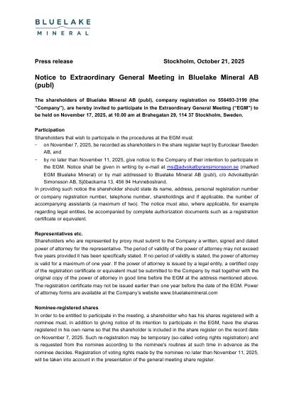 The shareholders of Bluelake Mineral AB (publ), company registration no 556493-3199 (the "Company"), are hereby invited to participate in the Extraordinary General Meeting ("EGM") to be held on November 17, 2025, at 10.00 am at Brahegatan 29, 114 37 Stockholm, Sweden.