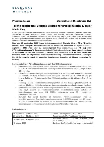 Idag, den 29 september 2025, inleds teckningsperioden i Bluelake Mineral AB:s ("Bluelake Mineral" eller "Bolaget") företrädesemission av aktier som beslutades av styrelsen den 17 september 2025 med stöd av bemyndigandet från årsstämman den 15 maj 2025 ("Företrädesemissionen"). Teckningsperioden i Företrädesemissionen löper från och med den 29 september 2025 till och med den 13 oktober 2025. Observera dock att vissa banker och förvaltare kan ha ett tidigare sista svarsdatum för teckning i Företrädesemissionen. Aktieägare bör därför kontrollera med sin bank eller förvaltare om dessa har ett tidigare svarsdatum för teckning.