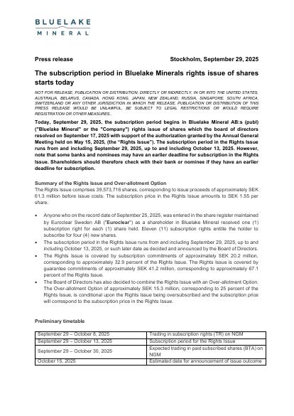 Today, September 29, 2025, the subscription period begins in Bluelake Mineral AB:s (publ) ("Bluelake Mineral" or the "Company") rights issue of shares which the board of directors resolved on September 17, 2025 with support of the authorization granted by the Annual General Meeting held on May 15, 2025, (the "Rights Issue"). The subscription period in the Rights Issue runs from and including September 29, 2025, up to and including October 13, 2025. However, note that some banks and nominees may have an earlier deadline for subscription in the Rights Issue. Shareholders should therefore check with their bank or nominee if they have an earlier deadline for subscription.