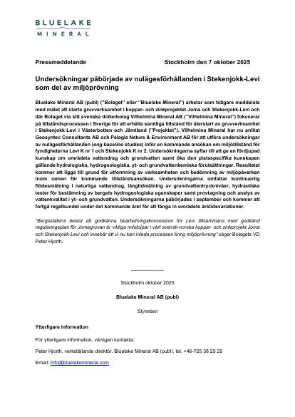 Bluelake Mineral AB (publ) ("Bolaget" eller "Bluelake Mineral") arbetar som tidigare meddelats med målet att starta gruvverksamhet i koppar- och zinkprojektet Joma och Stekenjokk-Levi och där Bolaget via sitt svenska dotterbolag Vilhelmina Mineral AB ("Vilhelmina Mineral") fokuserar på tillståndsprocessen i Sverige för att erhålla samtliga tillstånd för återstart av gruvverksamhet i Stekenjokk-Levi i Västerbotten och Jämtland ("Projektet"). Vilhelmina Mineral har nu anlitat Geosyntec Consultants AB och Pelagia Nature & Environment AB för att utföra undersökningar av nulägesförhållanden (eng baseline studies) inför en kommande ansökan om miljötillstånd för fyndigheterna Levi K nr 1 och Stekenjokk K nr 2. Undersökningarna syftar till att ge en fördjupad kunskap om områdets vattendrag och grundvatten samt öka den platsspecifika kunskapen gällande hydrologiska, hydrogeologiska, yt- och grundvattenkemiska förutsättningar. Resultatet kommer att ligga till grund för utformning av verksamheten och bedömning av miljöpåverkan inom ramen för kommande tillståndsansökan. Undersökningarna omfattar kontinuerlig flödesmätning i naturliga vattendrag, långtidmätning av grundvattentrycknivåer, hydrauliska tester för bestämning av bergets hydrogeologiska egenskaper samt provtagning och analys av vattenkvalitet i yt- och grundvatten. Undersökningarna påbörjades i september och kommer att fortgå regelbundet under det kommande året för att fånga in områdets årstidsvariationer.
