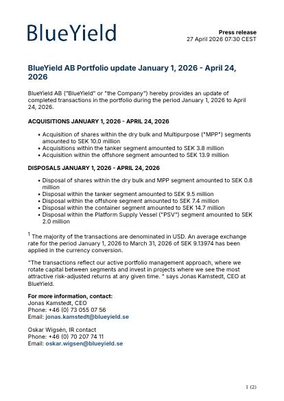 BlueYield AB ("BlueYield" or "the Company") hereby provides an update of completed transactions in the portfolio during the period January 1, 2026 to April 24, 2026.