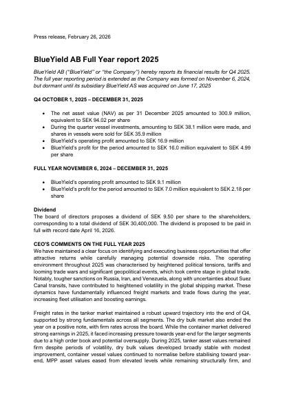 BlueYield AB ("BlueYield" or "the Company") hereby reports its financial results for Q4 2025. The full year reporting period is extended as the Company was formed on November 6, 2024, but dormant until its subsidiary BlueYield AS was acquired on June 17, 2025