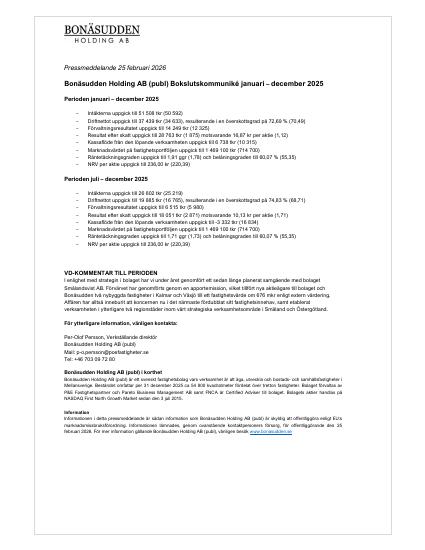 Informationen i detta pressmeddelande är sådan information som Bonäsudden Holding AB (publ) är skyldig att offentliggöra enligt EU:s marknadsmissbruksförordning. Informationen lämnades, genom ovanstående kontaktpersoners försorg, för offentliggörande den 25 februari 2026. För mer information gällande Bonäsudden Holding AB (publ), vänligen besök www.bonasudden.se