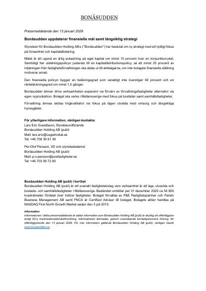 Informationen i detta pressmeddelande är sådan information som Bonäsudden Holding AB (publ) är skyldig att offentliggöra enligt EU:s marknadsmissbruksförordning. Informationen lämnades, genom ovanstående kontaktpersoners försorg, för offentliggörande den 13 januari 2026. För mer information gällande Bonäsudden Holding AB (publ), vänligen besök www.bonasudden.se