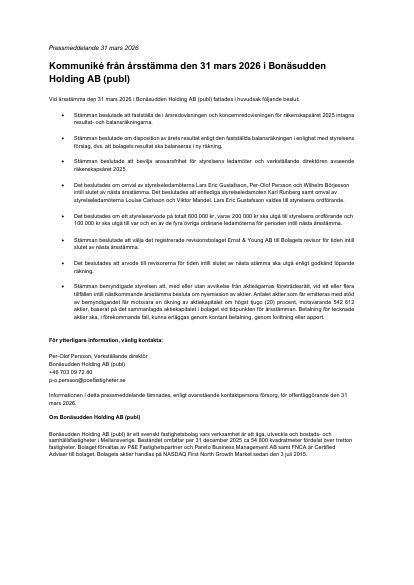 Kommuniké från årsstämma den 31 mars 2026 i Bonäsudden Holding AB (publ)