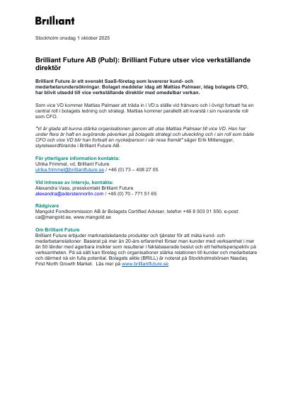 "Vi är glada att kunna stärka organisationen genom att utse Mattias Palmaer till vice VD. Han har under flera år haft en avgörande påverkan på bolagets strategi och utveckling och i sin roll som både CFO och vice VD blir han fortsatt en nyckelperson i vår resa framåt" säger Erik Mitteregger, styrelseordförande i Brilliant Future AB.