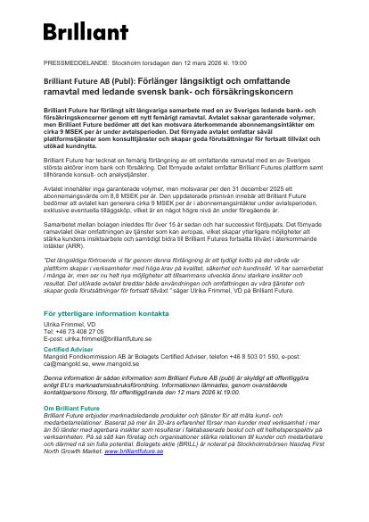 Brilliant Future har förlängt sitt långvariga samarbete med en av Sveriges ledande bank och försäkringskoncerner genom ett nytt femårigt ramavtal. Avtalet saknar garanterade volymer, men Brilliant Future bedömer att det kan motsvara återkommande abonnemangsintäkter om cirka 9 MSEK per år under avtalsperioden. Det förnyade avtalet omfattar såväl plattformstjänster som konsulttjänster och skapar goda förutsättningar för fortsatt tillväxt och utökad kundnytta.