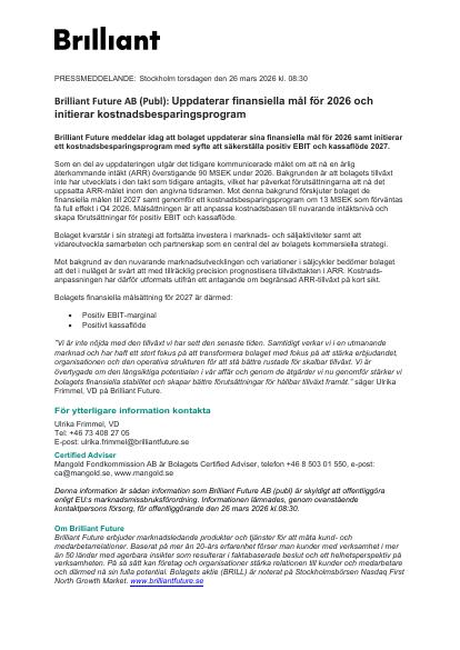 Denna information är sådan information som Brilliant Future AB (publ) är skyldigt att offentliggöra enligt EU:s marknadsmissbruksförordning. Informationen lämnades, genom ovanstående kontaktpersons försorg, för offentliggörande den 26 mars 2026 kl.08:30.