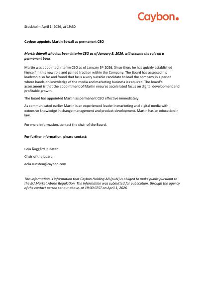 This information is information that Caybon Holding AB (publ) is obliged to make public pursuant to the EU Market Abuse Regulation. The information was submitted for publication, through the agency of the contact person set out above, at 19:30 CEST on April 1, 2026.