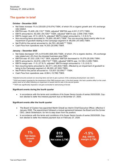 During the end of 2025 the market conditions have continued to be challenging. I can see that Caybon's business areas have strong resilience in several ways at the same time their client offerings need to be updated to adjust to current market conditions. This is especially true for Mediaplanet.