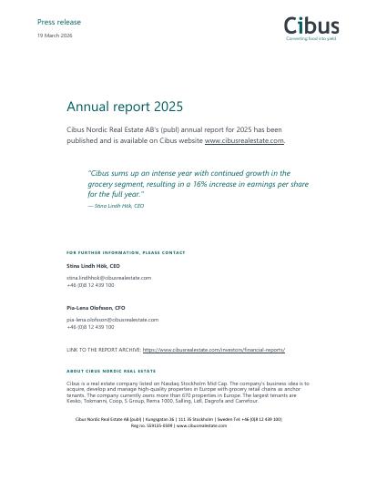 Cibus Nordic Real Estate AB's (publ) annual report for 2025 has been published and is available on Cibus website www.cibusrealestate.com.