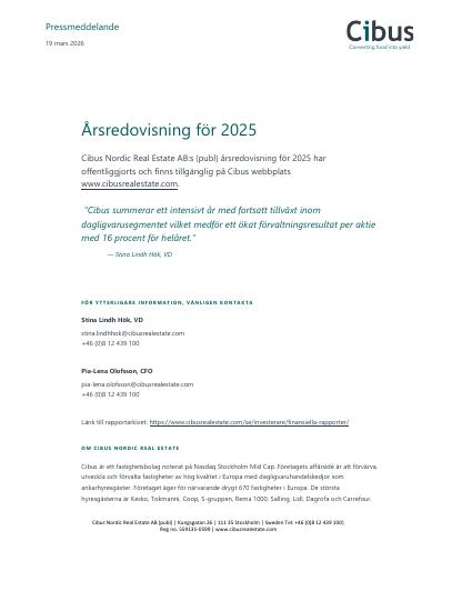 Cibus Nordic Real Estate AB:s (publ) årsredovisning för 2025 har offentliggjorts och finns tillgänglig på Cibus webbplats www.cibusrealestate.com.