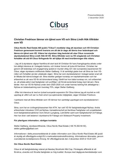 Cibus Nordic Real Estate AB (publ) ("Cibus") meddelar idag att styrelsen och VD Christian Fredrixon gemensamt kommit överens om att det är dags att lämna över ledarskapet och lämna sin tjänst som VD. Vidare har styrelsen idag beslutat att utse Cibus nuvarande styrelseledamot Stina Lindh Hök till VD. Stina tillträder som ny VD omgående och Christian fortsätter att stå till Cibus förfogande för att hjälpa till med överlämningen tills vidare.
