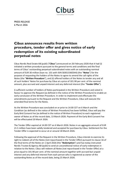 Cibus Nordic Real Estate AB (publ) ("Cibus") announced on 26 February 2026 that it had (i) initiated a written procedure pursuant to the general terms and conditions and the final terms of Cibus' outstanding perpetual subordinated notes with an outstanding nominal amount of EUR 30 million (loan no. 101 with ISIN SE0013360344) (the "Notes") for the purpose of requesting the holders of the Notes to agree to amend the call rights of the Notes (the "Written Procedure"), and (ii) offered holders of the Notes to tender any and all of such holders' Notes for purchase by Cibus at a price of 101.90 per cent. of the nominal amount, plus accrued and unpaid interest and any deferred interest (the "Tender Offer").